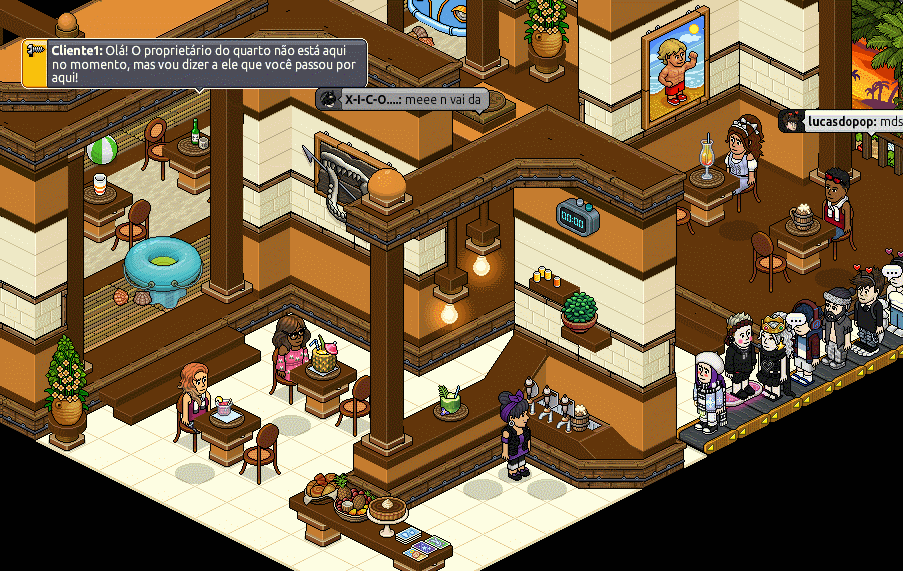 4.º Passo: O objetivo do jogo é servir drinks aos bots. Para isso, ande até ao "Balão da Sorte" perto dos "Drinks Sunset Café". De seguida, um bot irá acenar. Ande até ao "Balão da Sorte" perto dele, para que faça o seu pedido. Depois vá até ao "Balão da Sorte" perto do "Bar Fábrica Bubblejuice" e fale "preparar". No fim, volte para próximo do bot do pedido e fale "servir". Repita este processo 5 vezes e, depois, suba no "Balão da Sorte" perto do coco para vencer. Atenção! Você terá 2 minutos e 30 segundos para cumprir o objetivo do jogo.