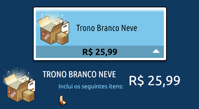 Nesta sexta-feira (22/12), entrou ao Habbo Shop a Oferta Trono Branco Neve com preço de R$ 25,99 BR ou 5,99 €. A oferta acompanha um emblema exclusivo.